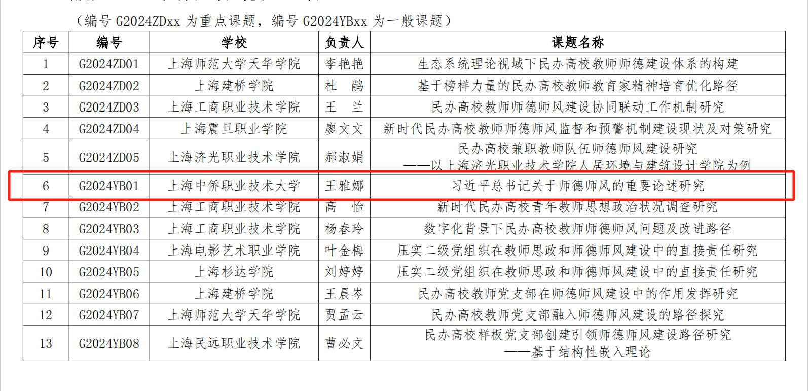 近日,上海民办高校教师思政工作研究基地发布了《关于 2024 年上海民办高校教师思政工作研究基地课题申报工作的通知》,经教师申请、研究基地审核、专家评审决定,重点课题 5 项、一般课题 17 项,予以立项。其中,我校马克思主义学院教师王雅娜、建筑工程学院教师许宏发与陈明申报的课题喜获立项!本次课题申报的成功立项,不仅是对我校教师科研能力的肯定,更是对我校在思政工作中所取得成果的认可。学校将坚持以习近平新时代中国特色社会主义思想为指导,进一步加强思政课教师队伍建设,深化课程思政改革,鼓励教师们在思政教育和科研领域积极探索,不断提升教学水平和科研能力,为上海民办高校教师思政工作贡献更多智慧和力量。