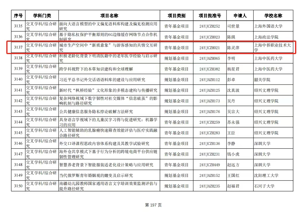 根据《教育部社科司关于2024年度教育部人文社会科学研究一般项目立项的通知》,上海中侨职业技术大学经济与管理学院旅游管理专业陈灵萍老师主持申报的青年基金项目《城市生产空间中“新质意象”与游客感知的共情交互研究》获批立项资助(项目批准号:24YJCZH021)。