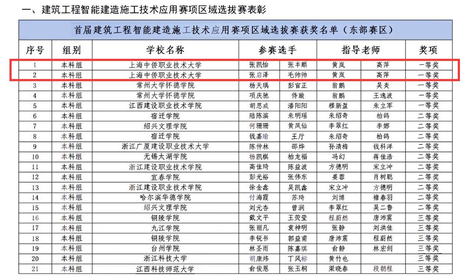 祝贺上海中侨职业技术大学建筑工程学院首届建筑工程智能建造施工技术应用赛项区域赛获多项荣誉!