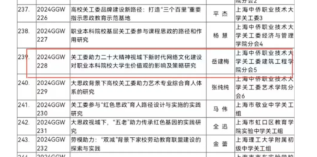根据各单位面上课题申报情况,经研究,确定复旦大学“高校关工委助力大思政教育的实践研究”等263个课题为第17次(2024年)上海市教育系统关心下一代工作立项课题。其中上海中侨职业技术大学建筑工程学院直属党副书记岳建梅负责的《关工委助力二十大精神视域下新时代网络文化建设对职业本科院校大学生价值观的影响及策略研究》课题成功立项。