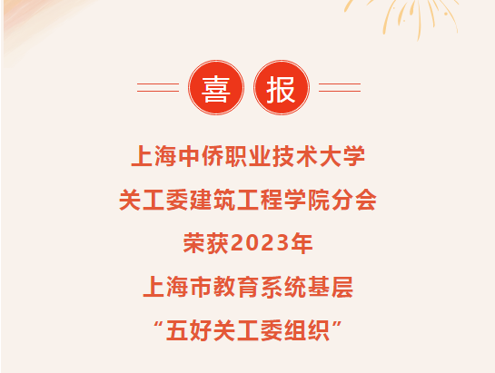 2023年,上海市各高校关工委、各区教育关工委、中职分会、高职分会、民办高校分会以党的二十大精神和习近平总书记关于关心下一代工作的重要指示为指引,结合开展先行先试工作,积极创建“领导班子建设好、骨干队伍作用好、制度健全执行好、活动经常效果好、积极探索创新好”的基层“五好关工委组织”,取得了较显著成效。为表彰先进、树立典型,进一步推进各级基层关工委建设和工作高质量发展,经研究决定:授予上海中侨职业技术大学关工委建筑工程学院分会“2023年上海市教育系统基层‘五好关工委组织’”荣誉称号。