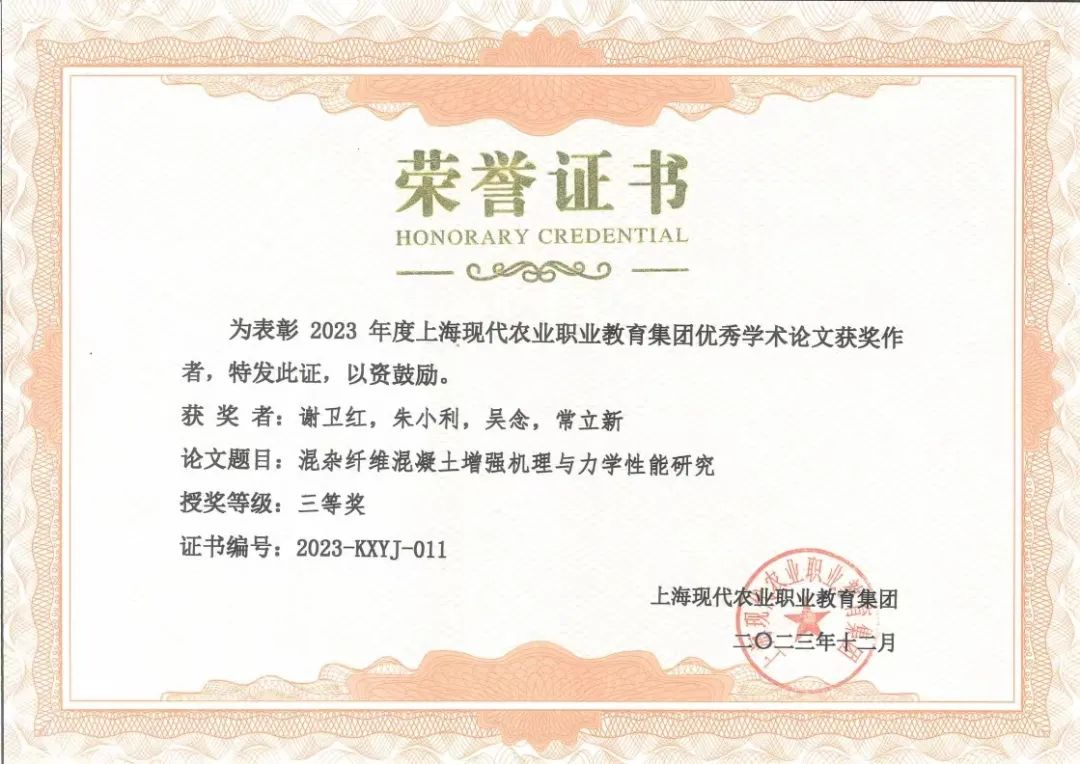 为深入贯彻落实党的二十大精神,助力国家创新高地建设,强化学术成果的导向,增强集团的学术影响力,凝聚专家学者的智慧力量,合力推动高质量发展,上海现代农业职教集团组织了2023年度上海现代农业职教集团优秀论文评选活动。建筑工程学院认真组织、鼓励教师参与本次优秀论文的评奖申报。经专家评审,由朱小利、谢卫红、吴念、常立新四位老师共同编写的《混杂纤维混凝土增强机理与力学性能研究》论文获三等奖。建筑工程学院向本次比赛获奖教师表示热烈祝贺!接下来,建筑工程学院将继续积极鼓励学院师生参加科研活动、参与科研工作,不断锻炼本领、增长才干,聚力培养高素质应用型人才,为师生们提供有力支持,培育优质高水平研究成果。