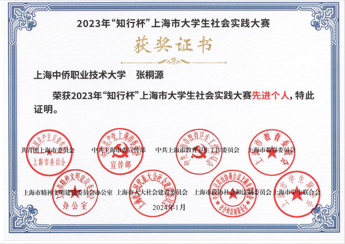 2023年11月11日,由团市委、市委宣传部、市教卫工作党委、市教委、市精神文明办、市人大社会委、市政协社法委和市学联联合主办的2023年“知行杯”上海市大学生社会实践大赛决赛成功举行。张桐源老师以帮助学生了解所学专业在相关行业中的实际价值,激励和引导青年学子在建设强国的征程中,坚定理想信念,荣获2023年“知行杯”上海市大学生社会实践大赛先进个人奖项。社会实践是学生了解社会、增长才干的重要载体,也是学校推进“大思政”育人的重要一环。通过此次比赛,建筑工程学院将以大学生社会实践为统揽,将社会实践与文化浸润、专业创新相结合,以系统思维推进社会实践工作做深做实,为培养有理想、敢担当、能吃苦、肯奋斗的新时代好青年做出贡献。