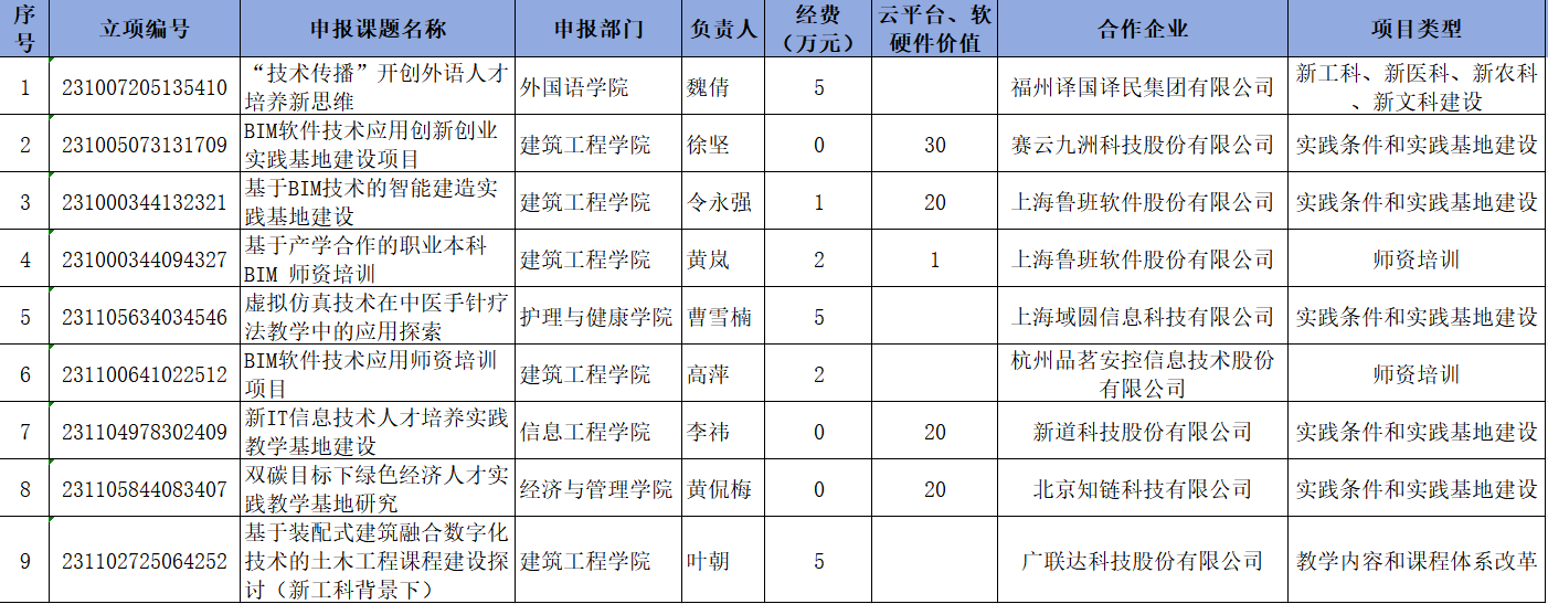 4月17日,教育部高教司下发了《教育部高等教育司关于公布2024年第一批产学合作协同育人项目立项名单的通知》,我校9个项目喜获立项。此次学校立项的9个项目获得了福州译国译民集团有限公司、赛云九洲科技股份有限公司、上海鲁班软件股份有限公司、广联达科技股份有限公司、上海域圆信息科技有限公司等多家知名企业的支持,校企协同致力于新工科建设、教学内容和课程体系改革、师资培训、实践条件和实践基地建设、教学内容和课程体系改革等。 近年来,我校高度重视校企产学合作,目前获教育部产学合作协同育人项目累计达42项,为学校的人才培养方案制定、课程体系创新、实践条件建设、创新创业教育等方面提供了新的契机,对于学校进一步创新产学合作协同育人机制,深化课堂教学改革和实践教学改革,推进学校高质量发展,具有重要意义。今后,我校将继续深化产教融合,加强对项目的指导和管理,高质高效推进项目实施,全面提高教学效能和教育质量。