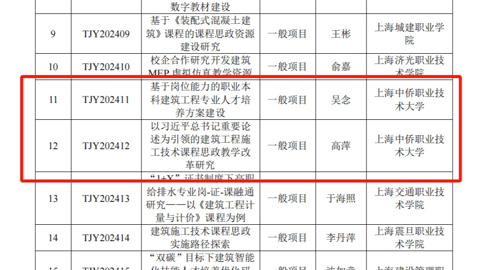 日前,2024年度上海高职高职土建类专业教育教学研究课题项目立项评审工作已经结束。上海高职高专土建类专业教学指导委员会组织专家将结果公示。上海中侨职业技术大学建筑工程学院教师吴念、高萍的项目成功立项。