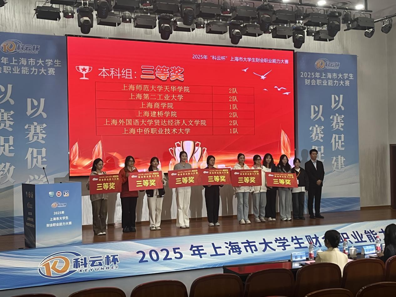 2025年11月9日,由上海市教育委员会主办、上海立信会计金融学院承办,2025年“科云杯”上海市大学生财会职业能力大赛在上海立信会计金融学院(浦东校区)成功举办。比赛共有来自同济大学、上海大学、华东理工大学等18所上海本科院校的35支参赛队伍。由大数据与会计专业的叶晓文、周颖钰、王薇、王斐组成的中侨大学1队,指导老师魏金鹏、周星,荣获上海市三等奖。