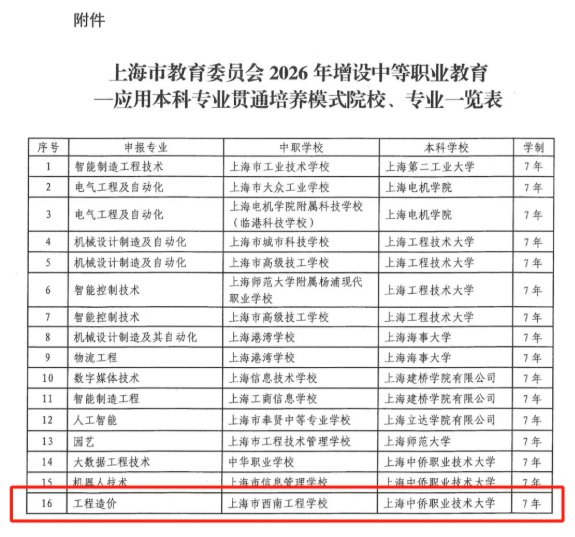 近日,上海市教育委员会正式发布《沪教委职〔2025〕22号》文件,批复2026年增设16个中等职业教育—应用本科专业贯通培养模式专业点。