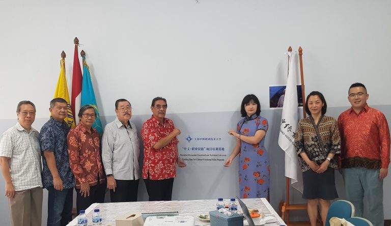 当地时间4月24日上午,由上海中侨职业技术大学与ABDI SISWA基金会合作共建的“中文+职业技能”海外人才培养基地在雅加达爱迪希斯育才学校正式揭牌成立。2025年是中国印尼建交75周年暨万隆会议70周年,两校之间借此契机展开深度合作,为 “一带一路” 倡议下的人才培养注入澎湃动力。ABDI SISWA基金会的主席Jusuf Iskandar、董事会主席Ir. Pandji Kusuma、财务主管Deddy Suwanda、基金会成员Simon Sumardi、赞助委员会成员Ferry Widagda,基金会首席顾问顾梵女士、国际学校(中国)代表侯逸枫,上海中侨职业技术大学校长助理、基金会理事长严蕙女士,及爱迪希斯育才学校的部分教职员工共同参加,见证了这一重要时刻。签约揭牌仪式上,Jusuf Iskandar代表ABDI SISWA基金会,严蕙女士代表上海中侨职业技术大学,签署合作协议,并为“中文+职业技能”海外人才培养基地揭牌。