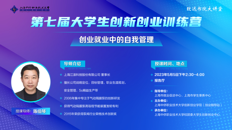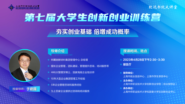 夯实创业基础,倍增成功概率授课导师:于君国授课时间:2023年4月28日14:30-15:30地点:1号楼(图文信息楼)2楼报告厅创业就业中的自我管理授课导师:陈伯琴授课时间:2023年5月5日14:30-16:00地点:1号楼(图文信息楼)2楼报告厅创业者从0—1的规划授课导师:杨晨俊授课时间:2023年5月12日14:30-15:30地点:1号楼(图文信息楼)2楼报告厅