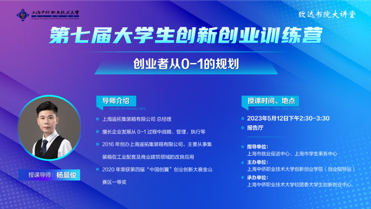 创业者从0—1的规划授课导师:杨晨俊授课时间:2023年5月12日14:30-15:30地点:1号楼(图文信息楼)2楼报告厅