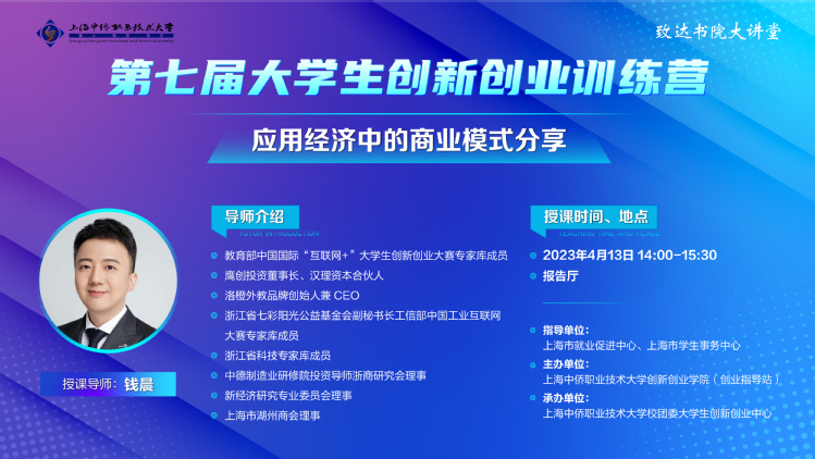 应用经济中的商业模式分享授课导师:钱晨授课时间:2023年4月13日 14:00-15:30地点:1号楼(图文信息楼)2楼报告厅