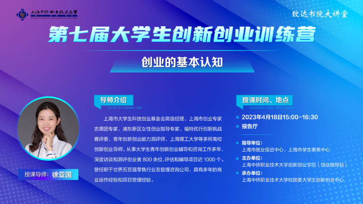 创业的基本认知授课导师:徐亚国授课时间:2023年4月18日14:00-15:30地点:1号楼(图文信息楼)2楼报告厅