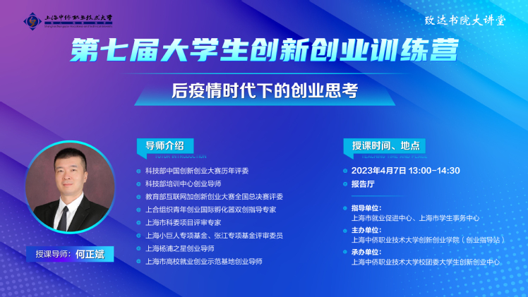 后疫情时代下的创业思考授课导师:何正斌授课时间:2023年4月7日13:00-14:30地点:1号楼(图文信息楼)2楼报告厅
