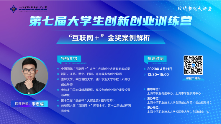 “互联网+”案例解析授课导师:宋志成授课时间:2023年4月11日13:30-15:00地点: “腾讯会议”+“中侨青年”视频号