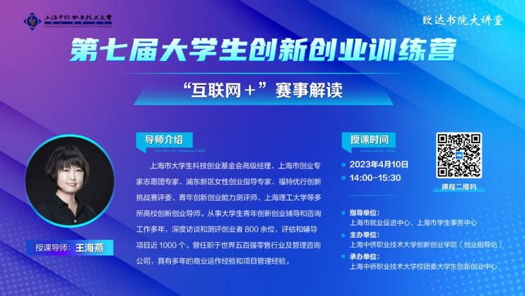 讲座2:“互联网+”赛事解读授课导师:王海燕授课时间:2023年4月10日14:00-15:30地点:“腾讯会议”+“中侨青年”视频号