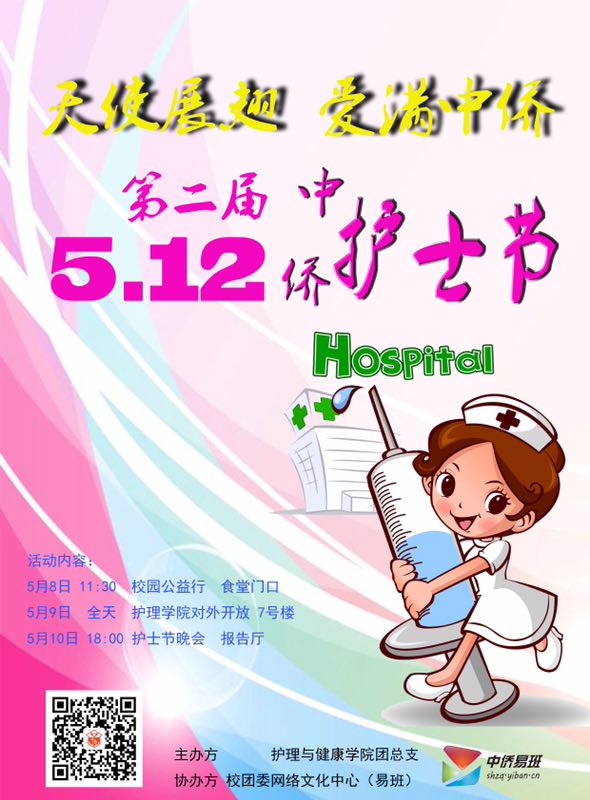 活动主题:天使展翅爱满中桥活动名称:第二届5.12护士节晚会讲座时间:2017年5月10日18:00讲座地点:1#2F报告厅主办单位:护理与健康学院团总支协办单位:校团委网络文化中心(易班)