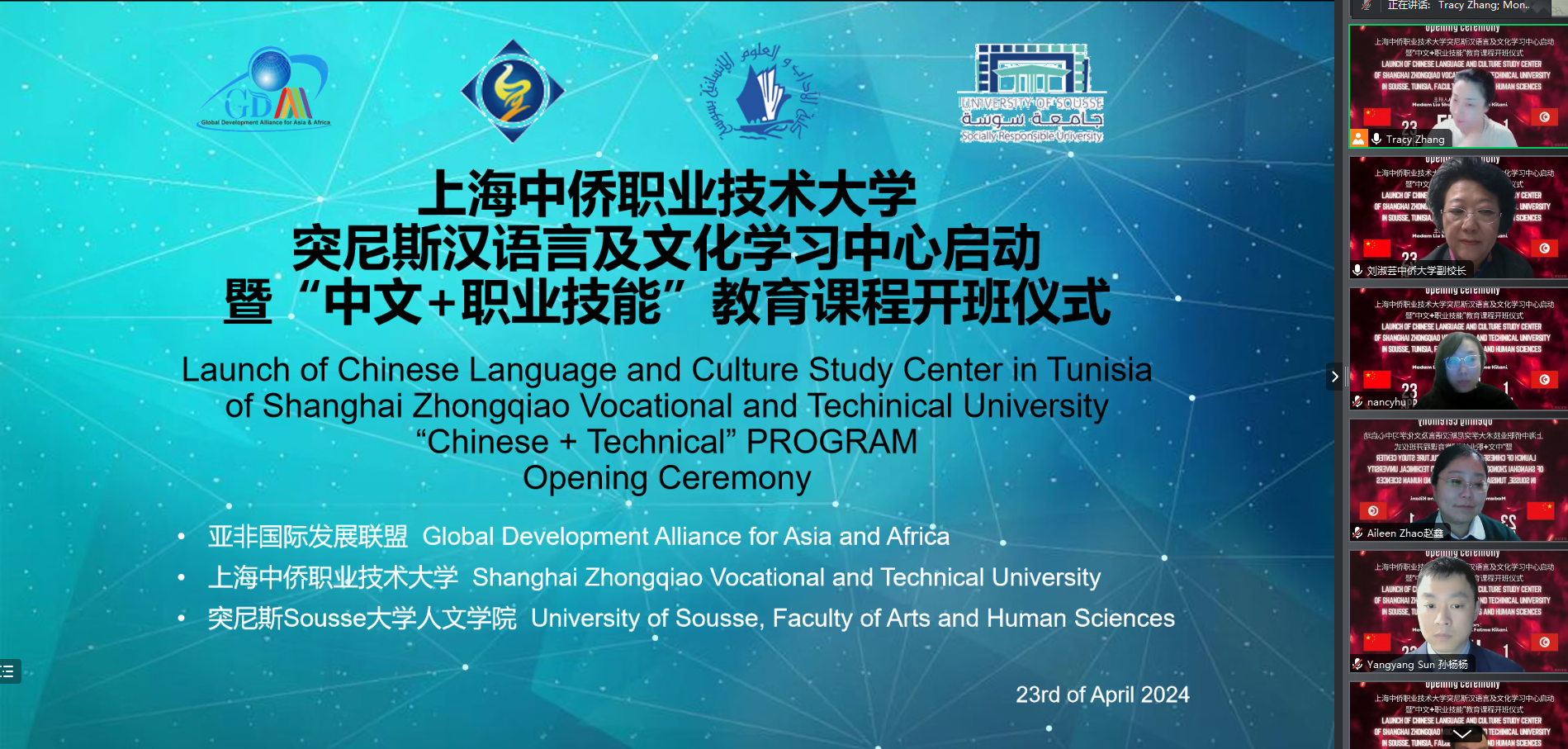 4月23日,上海中侨职业技术大学隆重举行了突尼斯汉语言及文化学习中心的启动暨“中文+职业技能”教育课程开班仪式。亚非国际发展联盟亚太区主席TracyZhang女士、亚非国际发展联盟秘书长Bechir Mhalla先生、突尼斯苏塞大学(University of Sousse)副校长Moez Khenissi教授、艺术与人文科学学院副院长 Monia Chouari教授、上海中侨职业技术大学副校长刘淑芸、外国语学院院长李梅出席启动仪式并致辞,我校国际交流处、宣传部参加会议。启动仪式由亚非国际发展联盟亚太区主席Tracy Zhang和艺术与人文科学学院Fatma Kilani博士共同主持。启动仪式上,中侨大学和苏塞大学的领导共同启动了这一重要的合作项目,希望通过搭建更多的学习平台,为有意愿到中国学习、实习或工作的突尼斯青年提供学习语言、了解文化、掌握技能的机会,同时拓宽更广阔的国际视野。希望汉语言及文化学习中心能发挥多功能平台的作用,成为学习汉语的课堂、了解中国的窗口和建立友谊的桥梁。建立汉语言及文化学习中心,是学校服务国家“一带一路”建设和推进国际交流合作的重要举措,标志着我校在推动国际