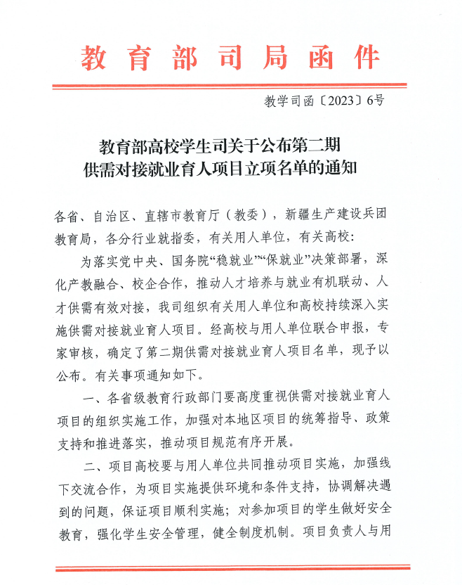 近日,教育部高校学生司《关于公布第二期供需对接就业育人项目立项名单的通知》(教学司函〔2023〕6号)发布,上海中侨职业技术大学信息工程学院与启明星辰信息技术集团股份有限公司,建筑工程学院与鲁班软件股份有限公司、上海华城工程建设管理有限公司,经济与管理学院与金拱门(中国)有限公司,智能制造学院与上海巧园投资发展有限公司,就业办与清飞信息科技(上海)有限公司共同合作的8个就业育人项目获得教育部第二批立项,对我校持续深化产学研合作,为国家培养更高质量更高素质的技能型人才提供支持。为落实党中央、国务院“稳就业”“保就业”决策部署,深化产教融合、校企合作,推动人才培养与就业有机联动、人才供需有效对接,继2022年我校有4个项目获得首批立项后,本次有五个二级单位积极申报,最终有8个项目得以落地。学校将以此为契机,更加高度重视与国内外知名企业进行深度合作,强化校企合作协同构建育人平台,严格遵循“以提高人才培养质量为核心,以创新人才培养为重点,以完善教学条件和质量保障为支撑”的基本要求,不断深化产教融合,持续推动职业教育高质量发展。