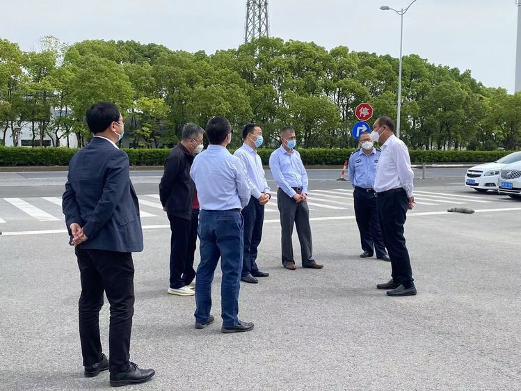 金山区政法委书记唐卫星、区教育局党工委书记顾宏伟和张堰镇党委书记施文权调研中侨大学防疫工作