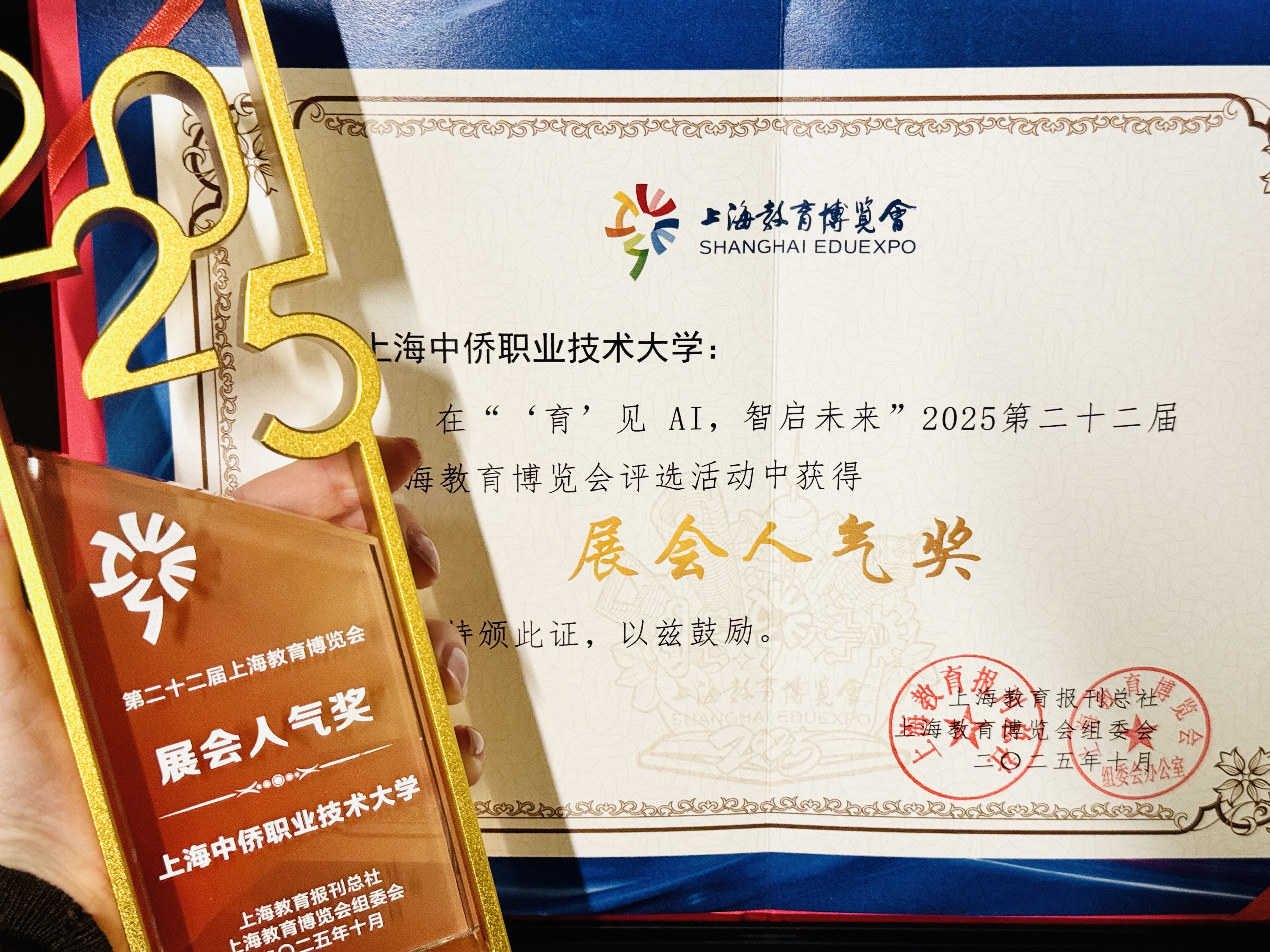 10月14日,2025第二十二届上海教育博览会总结颁奖会在上海教育报刊总社举行。上海中侨职业技术大学在“‘育’见AI,智启未来”2025第二十二届上海教育博览会评选活动中再获“展会人气奖”!作为教博会的重要参与单位,我校对历届教博会予以高度重视,党委宣传部精心筹备,组织团队积极参展。学校已连续三年跻身展会高校人气榜单前二,屡获“风采展示奖”“展会人气奖”等重要荣誉。这一成绩,不仅彰显了社会各界对学校办学实力与品牌影响力的高度认可,更是我校长期以来深耕职业教育创新与实践成果的集中体现。