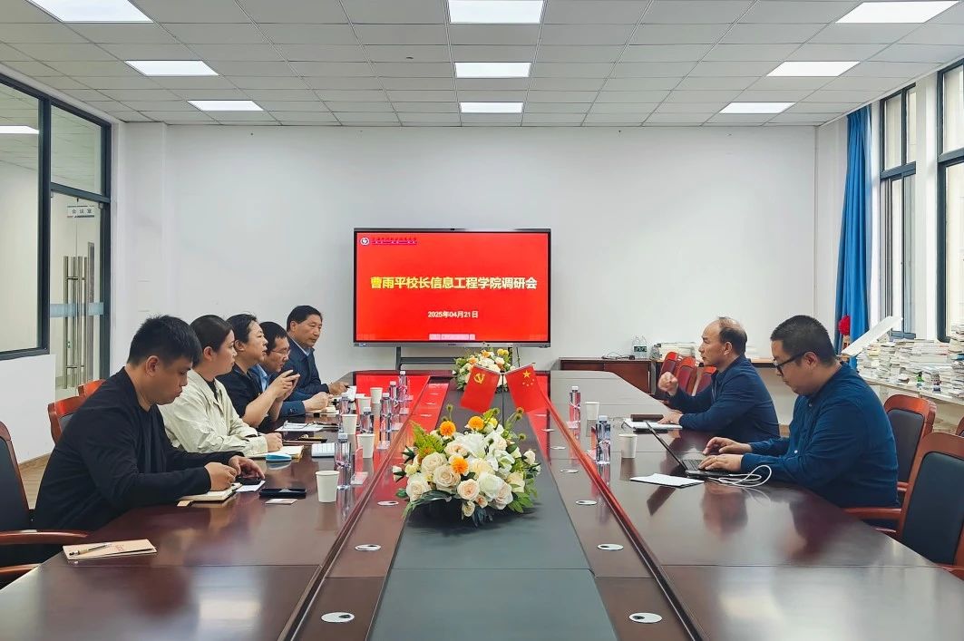 2025年4月21日下午,上海中侨职业技术大学校长曹雨平莅临信息工程学院调研指导工作,实地考察学院发展情况,并与学院党政领导班子进行座谈交流。校党政办主任马俊陪同调研。信息工程学院院长赵欣、党总支书记刘群、副院长袁明、副院长孙修东、党总支副书记唐斌等参加会议。会议由赵欣院长主持。