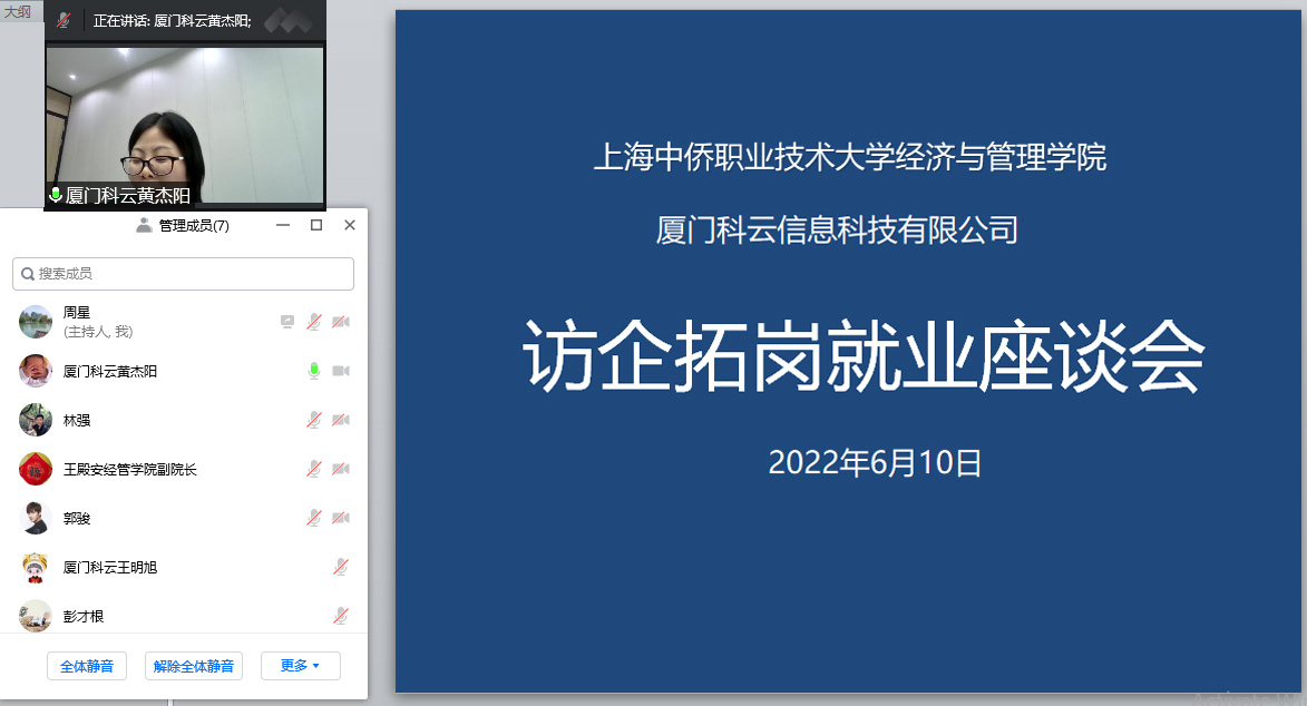 为抓住今年毕业生就业的关键期、冲刺期,深入贯彻党中央、国务院“稳就业”“保就业”决策部署,抢抓当前毕业生就业关键期,2022年5月26日,我院在腾讯会议上召开了第二次线上“访企拓岗促就业”专项行动座谈会。经济与管理学院院总支书记杨慧、副院长范海燕、金融专业主任钟小平以及金融专业教师唐波,与上海宜可环保科技有限公司人事部总监杨颖女士进行深入交流。会上,双方围绕校企合作、用人需求和人才培养等方面进行了交流。公司人事总监杨颖女士详细介绍了公司概况、企业文化、代表产品和合作案例等情况。范教授对企业复工复产、疫情期间企业的生产经营销售情况进行了全面的了解。杨慧书记表示,学校与宜可环保有很大的合作空间,希望双方加强沟通与联络,建立常态化联系互访机制,促进双方在学生就业、校园智慧化建设方面的深度合作。并约定等疫情过后去企业进行实地拜访。通过此次访企拓岗行动,进一步推进了2022届毕业生就业工作落实,积极拓展就业渠道,扩大与优质企业的合作,努力实现更高质量的就业目标。