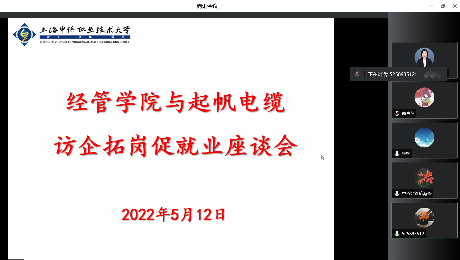 为深入贯彻落实党中央、国务院关于高校毕业生就业工作的决策部署和学校2022年“访企拓岗促就业”专项行动,2022年5月12日,经济与管理学院党总支书记杨慧老师,教学副院长范海燕教授,国际商务专业主任俞春英老师,线上拜访了上海起帆电缆股份有限公司人力资源部钱军玲部长,朱婉老师,并出席学校和企业联合举办的“访企拓岗促就业”专项座谈会暨线上会议。杨慧书记代表经管学院感谢起帆电缆对我院毕业生就业工作的大力支持,介绍了毕业生具有专业知识扎实、岗位适应能力好、做事踏实认真、工作稳定性强、以及对企业的忠诚度高等特点,她希望校企双方搭建良好的人才供需平台,建立常态化交流互访机制。杨慧书记详细询问了目前签约的10名大三毕业生情况,和钱部长协商了电子商务班开班事宜以及确定下一届学员招募。钱部长对经管学院毕业生给予高度评价,她表示,经管学院毕业生综合素质良好、专业能力强、实践能力突出,高度契合企业需求。钱部长希望双方共同探索校企合作模式,拓展合作关系,深化合作内容,进一步推动校企深度融合。范院长亲切询问了起帆电缆目前复工复产的情况,和钱部长就企业的用工情况也进行了意见交换。 就业工作是学校的生命线,经管学