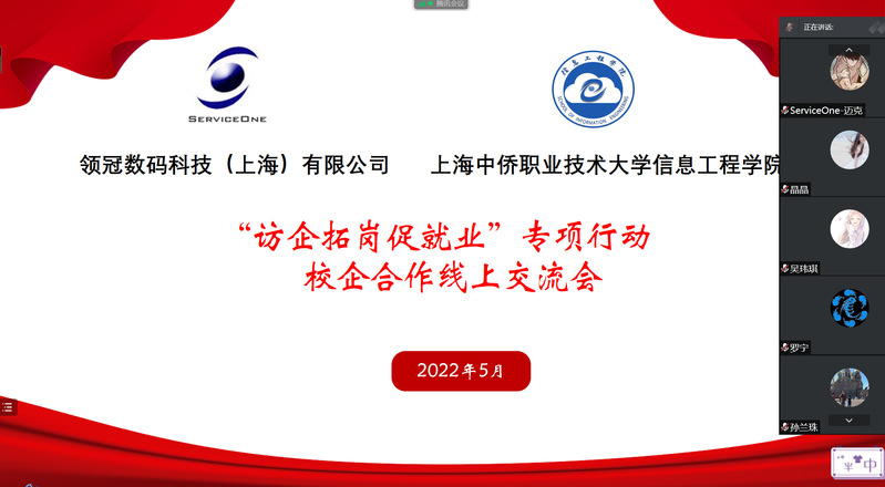 为贯彻落实党中央、国务院关于高校毕业生就业工作的决策部署,积极应对新形势下的就业压力,更好的发挥市场作用促进毕业生就业,5月5日下午,中侨大学信息工程学院与领冠数码科技(上海)有限公司开展“访企拓岗”专项行动线上交流会。参与本次会议的企业方领导有招聘经理郑伊滨,服务交付经理姜希,校园招聘主管李阳,校方领导有副校长罗宁,信息工程学院副院长魏鹏,党总支书记刘群,副书记唐斌,各专业主任以及19、20级辅导员老师。会议由信息工程学院党总支书记刘群主持。会议开始,刘群老师介绍到领冠数码科技(上海)有限公司从2019年就开始陆续招聘计算机专业学生前去实习就业,公司地点在黄浦区,但是单位提供住宿,工资待遇也不错因此吸引了不少学生留下来实习就业。信息工程学院副院长魏鹏介绍了学院概况、专业设置及以及简单介绍了目前2022届毕业生就业情况。感谢多年来企业给予学校的信任与支持,鼓励企业在学校人才培养的各个方面多多提出意见或建议;学校将结合行业企业发展需求,不断优化学科专业布局,提升人才培养质量,向社会精准输送更多高质量的人才。领冠数码科技(上海)有限公司招聘经理郑伊滨大致从企业情况、岗前培训模式、员工职业发
