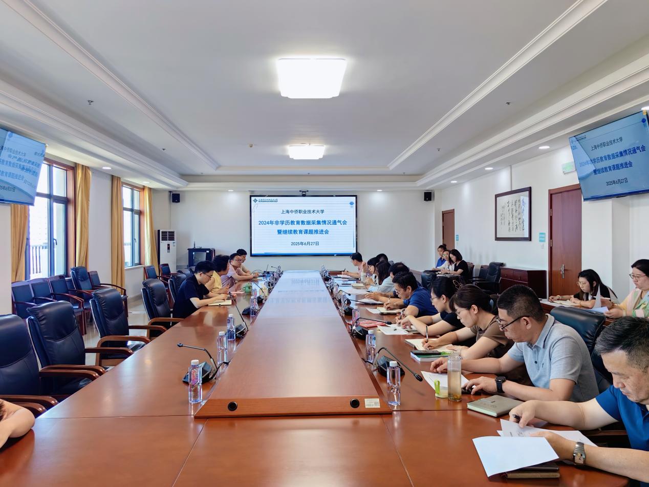 6 月 27 日,中侨大学召开 2024 年非学历教育数据采集情况通气会暨继续教育课题推进会。副校长刘淑芸、规划与质量管理处处长呼玉山、继续教育学院院长陈银桥、各二级学院相关工作人员参会,共同回顾 2024 年非学历培训工作成就,展望未来发展方向。会议由陈银桥主持。刘淑芸对学校继续教育过去一年的工作给予高度肯定。她指出,2024 年学校继续教育领域成绩斐然,斩获多项全国及上海市优秀案例奖,充分彰显学校在继续教育领域的卓越实力。在课题研究方面,5 个课题成功立项,其中 1 个重点课题、4 个一般课题,为继续教育理论探索注入强劲动力。此外,学校继续教育在拓展培训项目、提升培训质量等方面成果丰硕,有力提升学校社会服务能力。随后,她为在继续教育课题研究中表现突出的教师颁发立项证书,鼓励更多教师积极投身课题研究,为学校继续教育创新发展夯实理论根基。呼玉山对 2024 年度各学院非学历教育培训数据采集情况进行全面总结。他凭借详实数据,展示各学院在培训规模、类型、受众等方面的成果与亮点,同时也直言数据采集中存在的问题,并针对性提出改进措施与建议。他强调,后续需强化数据管理,确保数据真实、准确、完整,