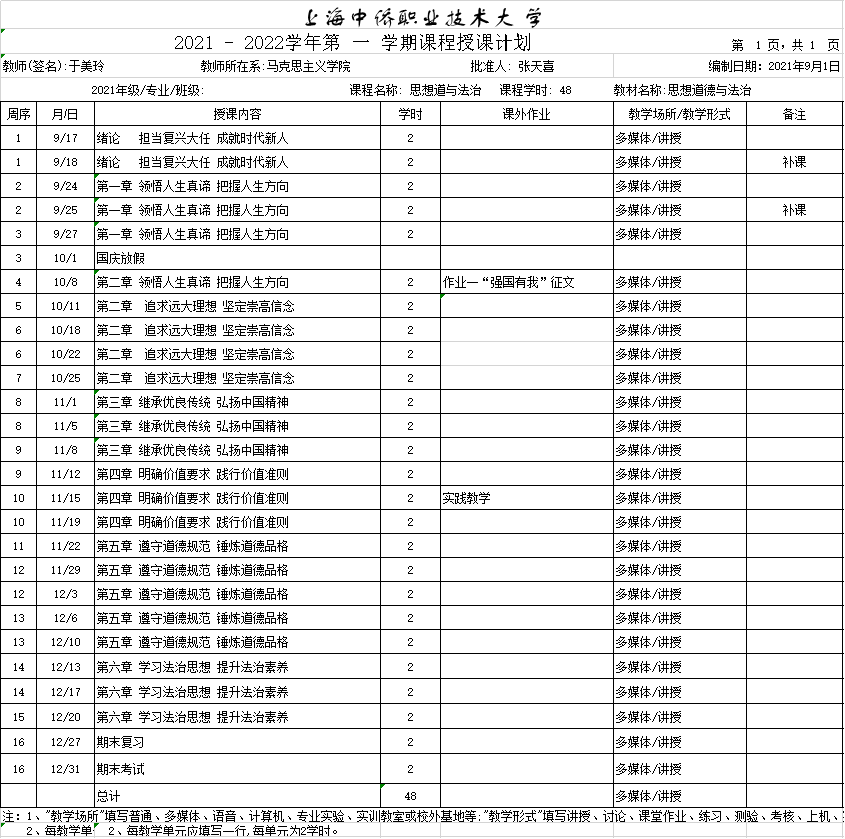 2021-2022学年第一学期《思想道德与法治》授课计划