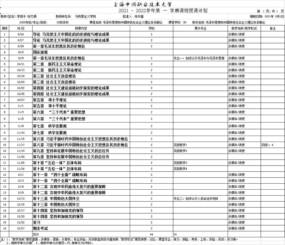 2021-2022学年第一学期《毛泽东思想和中国特色社会主义理论体系概论》授课计划