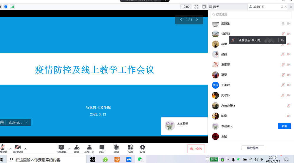 为配合学校做好疫情防控工作,确保线上教学秩序平稳运行,2022年3月13日,马克思主义学院在腾讯会议召开疫情防控和线上教学工作专题会议,副院长张天喜、党支部书记封晓莉及全体教师参加了会议,会议由张天喜主持。 会议伊始,副院长张天喜提醒所有校内外教师加强自我防护,做到“一米线”、“三件套”和“五还要”,同时,保证手机24小时开机,配合学校及时完成各项数据统计工作;另外,教师在线上授课时,对教学内容要严格把关,注意方式方法,积极与学生进行互动,创造良好的课堂氛围。张院长传达了《上海中侨职业技术大学在线教学质量评价标准(试行)》文件精神,要求所有教师按照评价要求,突出育人价值导向,以评促教、以评促学,提升教学质量和育人效果。最后,张院长就开学布置的教案撰写和概论课的调查问卷等工作任务做了跟进和指示。 党支部书记封晓莉向大家传达了学校书记工作会议精神和院长工作会议精神。第一,教师线上授课时,要坚守意识形态底线,在求稳的基础上求活求新;第二,结合以往的思政课育人实践成果,打造中侨马院特色的思政品牌;第三,充分发挥学院教师各自的优势,在职业生涯规划大赛、创新创业大赛、精品课程申报等方面做出成果;第四,善于发现和积极宣传学院教师和全体学生在疫情防控期间的先进事迹、典型案例,充分发挥党员的先锋模范作用和党支部的战斗堡垒作用;第五,在线上教学中关注学生的各种情况,及时与班级负责人、辅导员老师进行沟通;最后,封老师提醒大家要认真准备教案,上好每一节思政课,确保正确的政治方向、舆论导向和价值取向,展现马克思主义学院“民主、求实、团结、奋进”的学院风貌。 会议最后,所有教师就3月10号线上教学以来遇到的问题进行了讨论和交流。大家畅所欲言,针对学生的考勤、互动、平台运用和教学资源共享等问题,献计献策,集思广益,确保接下来的疫情防控和线上教学工作平稳高效进行,使马院的每位教师都能扬己所长、尽己所能、资源共享,保证马院各项工作顺利开展,创造出新的工作佳绩。