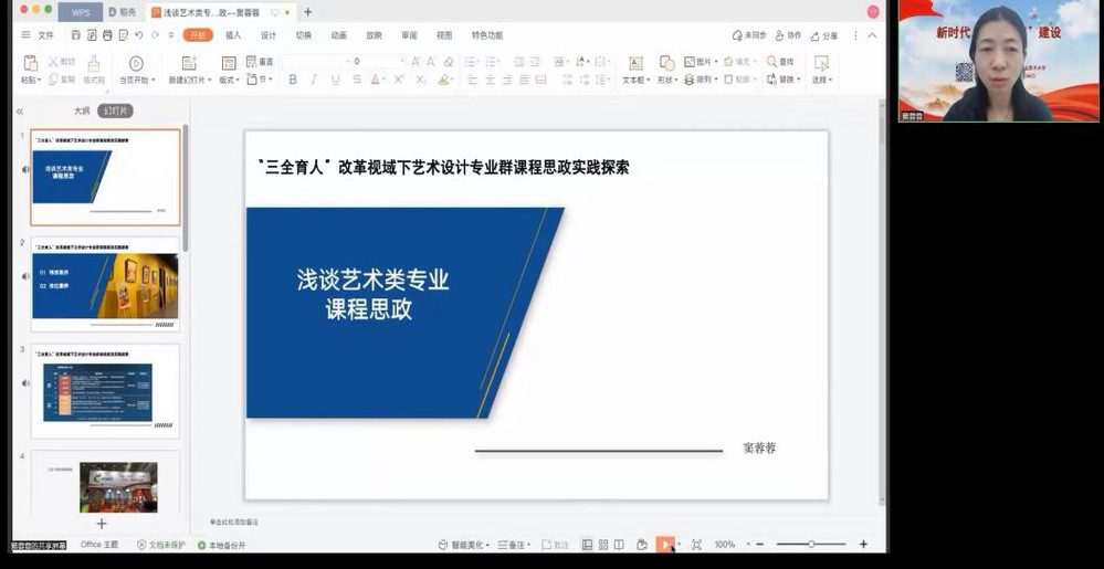 艺术学院副院长窦蓉蓉分享了“三全育人”改革视阈下艺术设计专业群课程思政的实践探索,着重从“情感素养”和“岗位素养”两个方面阐述如何提升艺术专业课程的育人效果。她重点提出,要建好用好实践教学基地,发挥好研学基地的实践教学功能,开发现场教学专题,开展实践教学。实践教学既可以发挥学生们的专业特长,也能提高学生们的爱国情怀、文化自信和人文素养。