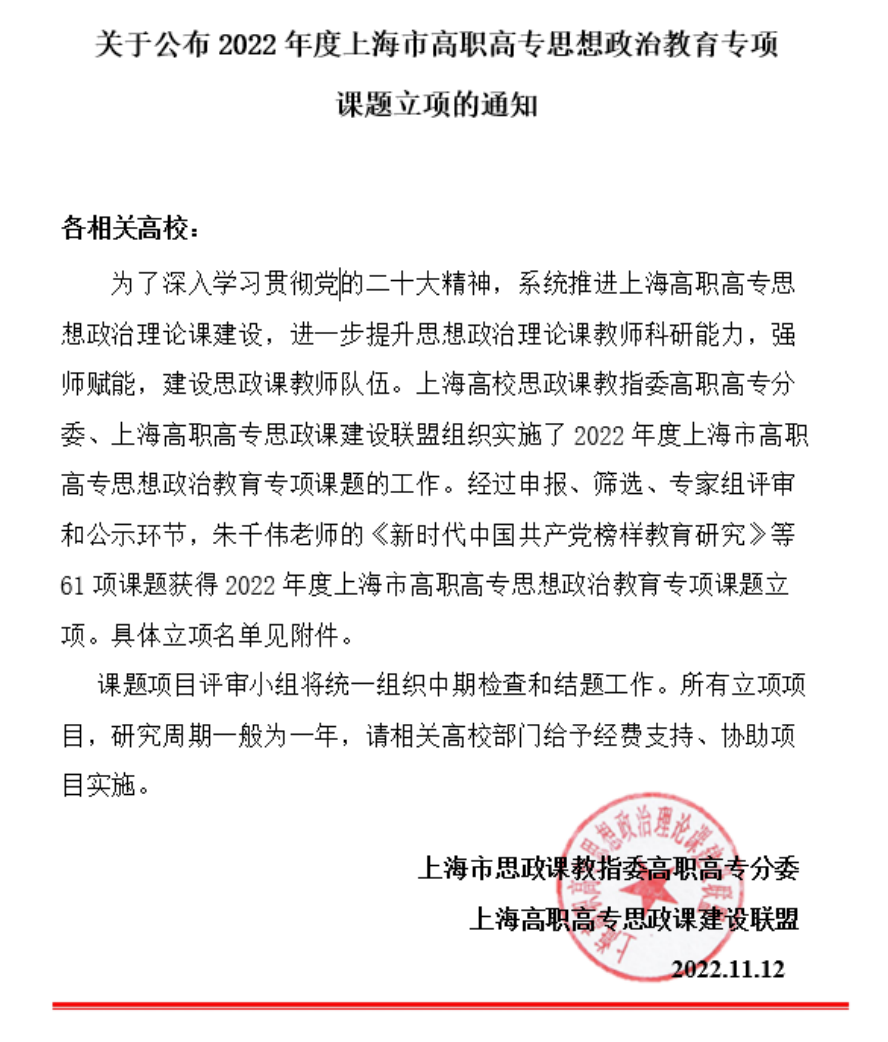 我院三位教师获得2022 年度上海市高职高专思想政治教育专项课题立项
