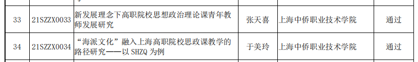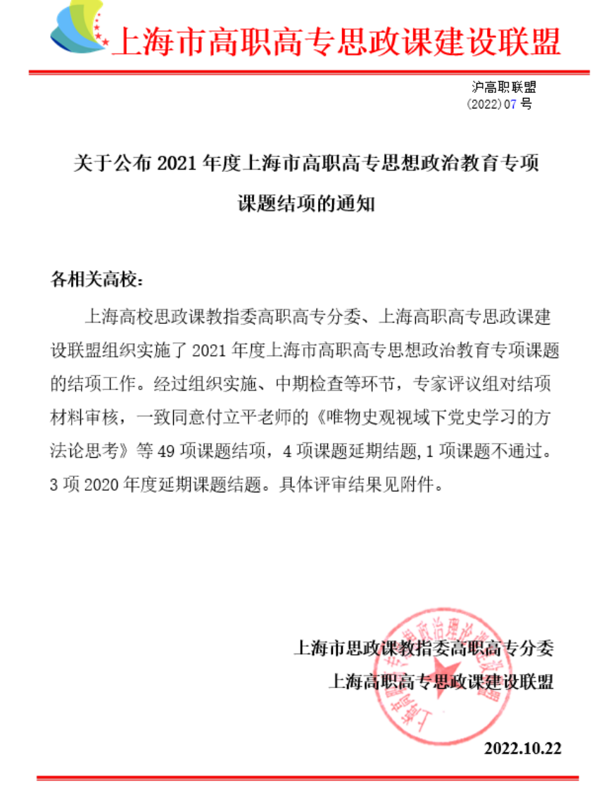 10月22日,上海市高职高专思政课建设联盟发布了《关于公布2021年度上海市高职高专思想政治教育专项课题结项的通知》,其中,我院张天喜课题《新发展理念下高职院校思想政治理论课青年教师发展研究》,以及于美玲课题《“海派文化”融入上海高职业思政课教学的路径研究——以SHZQ为例》顺利结项。