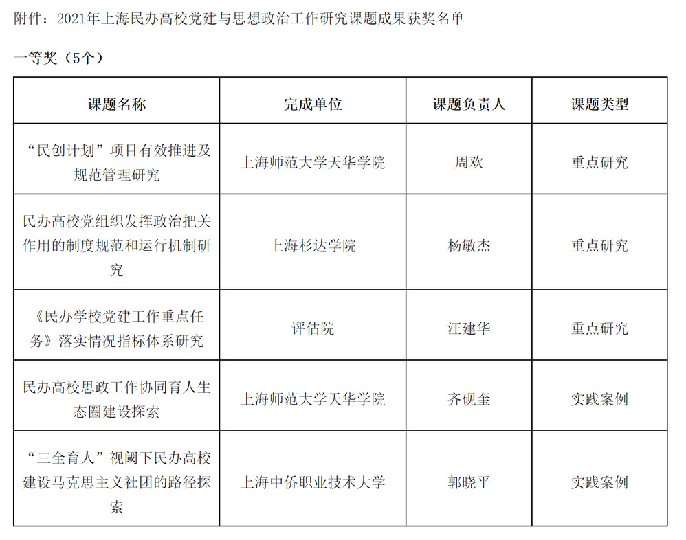近期,上海民办高校党建与思想政治工作研究中心公布了2021年课题成果获奖名单,马克思主义学院郭晓平老师实践案例课题《“三全育人”视阈下民办高校建设马克思主义社团的路径探索》获得一等奖,具有突破性意义。另马克思主义学院王猛老师获得第五届上海青教赛优秀奖。