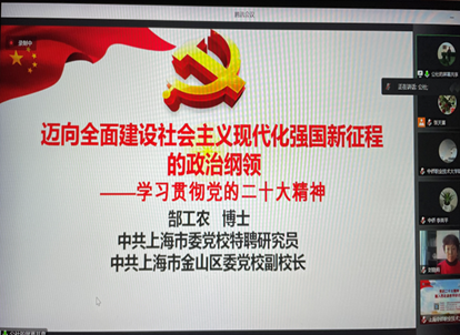 为深入学习宣传贯彻党的二十大精神,推进党的二十大精神融入思想政治理论课教学,引导学生用党的二十大精神武装头脑、指导行动,由上海民办高校思政课师资研修基地主办,上海中侨职业技术大学承办的“党的二十大精神融入思政课教学”研讨会于12月13日在我校信息图文中心518举行。中共上海市委党校特聘研究员、中共上海市金山区委党校副校长郜工农教授、上海中侨职业技术大学马克思主义学院党支部书记封晓莉副教授应邀做专题讲座。马克思主义学院全体教师及部分学生代表参加会议。会议由马克思主义学院副院长张天喜主持。