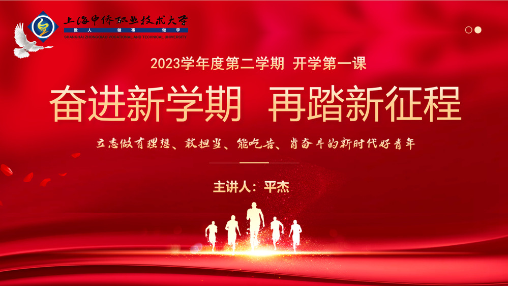 为深入贯彻落实习近平总书记等中央领导同志有关重要批示精神,全面贯彻落实教育部关于“全国高校以‘开学第一课’为重点开展2023年春季学期系列引导活动”有关部署要求,上海中侨职业技术大学党委书记平杰以“奋进新学期再踏新征程”为题,讲授2023年春季学期“开学第一课”,带领学生深入学习宣传贯彻党的二十大精神,进一步做好学校春季学期学生理想信念教育引导工作。