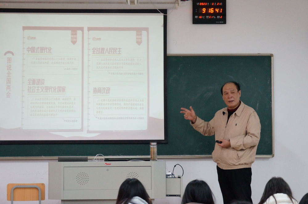 在第二部分“学习领会全国两会精神”中,平杰通过两会热点词带领同学们了解每一个词语背后的政治大事及其蕴含的重大意义。引导同学们增强学习贯彻的思想自觉和行动自觉,深刻领悟“两个确立”的决定性意义,增强“四个意识”、坚定“四个自信”、做到“两个维护”,深化认识,凝心铸魂。