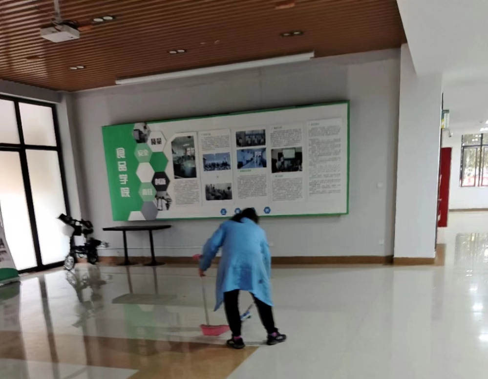 卢姝菱同学在教学楼内拍下了清洁阿姨们早早起来打扫处理教学楼卫生的一幕,就是这个普普通通的清洁工阿姨,不论阴天,雨天,晴天,还是严寒酷暑。她们永远忠于职守,默默无闻地扫着、扫着.....看着干干净净的校园,望着一尘不染的楼道,不禁感慨:“环卫工作真辛苦,清洁阿姨你们真了不起!