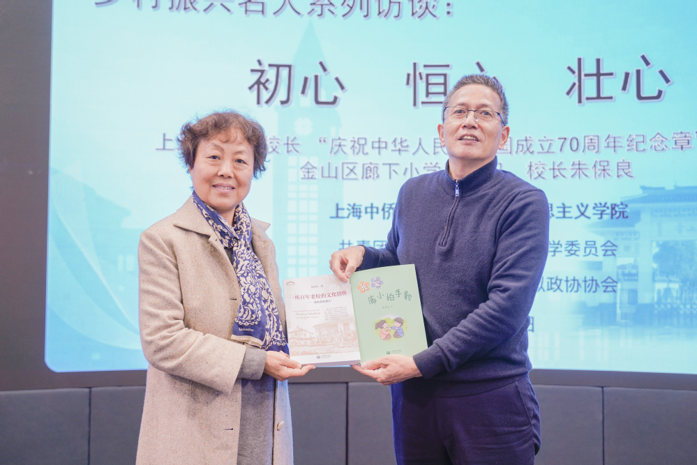 在访谈的过程中,朱保良校长提及廊下小学的宝藏展馆——杰出校友馆创办的初衷和历程,百年小学的特色出品——我爱廊小拍手歌创编的目的和德育意义,也介绍了廊下小学一部活生生的、立体的优质育人的经典校本课程——校友雕塑以及朱校长自己编著的《一所百年老校的文化情怀》。最后,朱校长将《一所百年老校的文化情怀》《我爱廊小拍手歌》两本书赠予中侨大学马克思主义学院以作留念,同时,共青团上海中侨职业技术大学委员会、上海中侨职业技术大学关心下一代工作委员会聘请朱保良校长担任上海中侨职业技术大学关心下一代指导团成员。