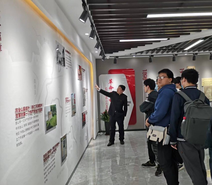 走进初心馆,通过初心图、初心屋、初心角营造的红色文化气息,同学们随即沉浸到一场探索红色印迹,激发奋斗伟力的研学之旅。 思政教师王猛老师在初心馆现场授课,带领学生跨越时空,追忆金山党史上的“第一”元素:金山第一位共产党员李一谔,金山第一个党组织和金山第一支农民武装队伍——农村赤卫队等,并结合历史背景,述说革命故事,追溯精神之源。诸多的“第一元素”是金山红色文化的源头,滋养着一代又一代的时代青年,让同学们感受到了革命时期共产党员“敢为天下先”的勇气与担当。