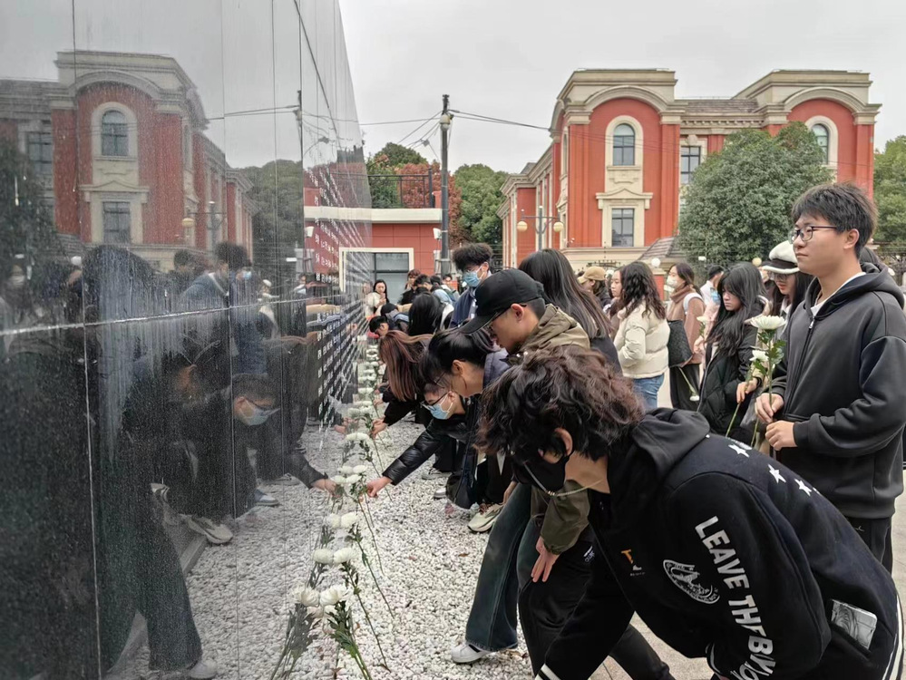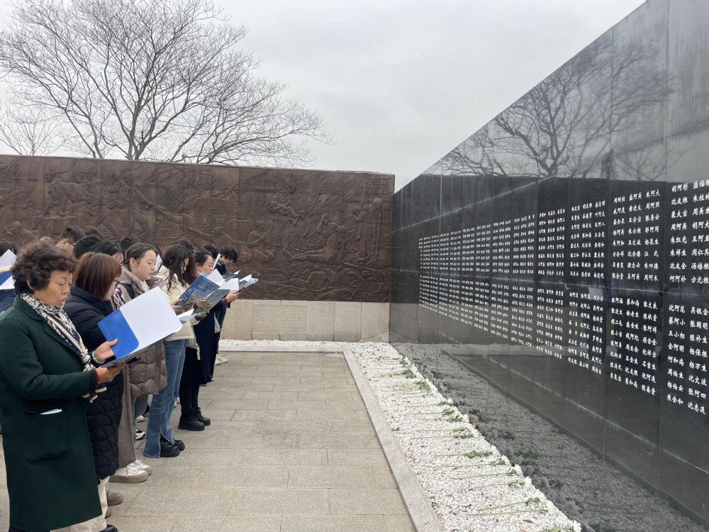 走进史料馆,师生们近距离观看每一件展览品,在各类文史资料、历史照片、革命文物前驻足静思、凝神观察。在讲解员的讲解下,大家认真了解了抗日战争时期侵华日军偷袭登陆金山卫后的屠杀暴行及驻防守军奋起反抗,中国共产党领导金山人民开展敌后持久抗战并走向胜利的历史史实。师生们在重温前辈们浴血奋战的故事时,也为日本侵略者所犯的残酷暴行感到痛心疾首,被抗日军民大无畏的英雄主义和舍家为国的爱国主义精神深深感动。随后,全体师生们一同至“十月初三”惨案被害乡民遇难墙前向遇难同胞献花,共同朗读了《和平宣言》。