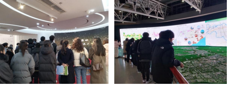 在这里,师生们一起参观了金山区规划展示中心。此中心以时间为主线、以城市发展为脉络、以党的引领为基石,运用光影隧道、高清互动屏幕、数字灯箱、步入式沙盘等现代科技手段向我们展示了金山区的历史建置沿革、撤县设区以来的发展、十三五的发展情况、十四五的转型规划情况。同学们驻足在一件件展品前,感叹金山区的巨大变化。参观后,师生更加深入了解了金山的地理环境、人文历史、发展成就及上海湾区的城市规划与金山区各镇未来的发展规划和方向。