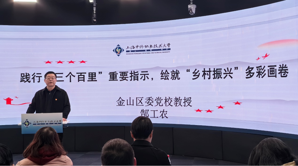 在听取各位思政课教师的讨论发言后,金山区委党校郜工农教授感慨颇深,他表示,习近平总书记“3.18”重要讲话精神是新时代学校思想政治理论课建设的纲领性文件,在“大思政课”建设过程中,思政课教师更要善用当地资源,上好大思政课。随后,郜教授紧紧围绕2007年习近平在金山调研时提出的“三个百里”重要指示,以“践行‘三个百里’重要指示,绘就‘乡村振兴’多彩画卷”为主题向全体思政课教师作主题报告。他提出,上海中侨职业技术大学地处金山,思政课教师可以充分利用当地现有资源,引导学生开展社会实践,将思政小课堂与社会大课堂有机结合,充分发挥思政课立德树人的关键作用。