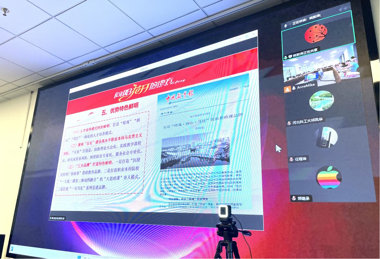 会议第四项由南宁职业技术大学马克思主义学院副院长姚敦泽介绍职业本科思政联盟文件准备情况。姚院长表示“通过与广东轻工职业技术大学、深圳职业技术大学、浙江机电职业技术大学等马院领导的沟通协商,南宁职业技术大学马克思主义学院于今年六月份完成了思政联盟的章程初稿、申请书模版等文件,后期将继续推进思政联盟相关会议的筹备工作。”这为联盟的建立打下了坚实的基础。