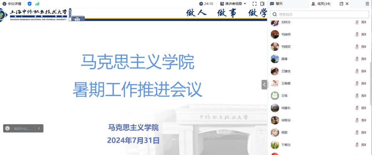 2024年7月31日,马克思主义学院通过腾讯会议召开暑期工作推进会议,会议主要围绕暑期前半程工作总结、新进教师自我介绍、线上课程中期工作汇报以及暑期后半程工作安排四个部分进行。会议由马克思主义学院常务副院长张天喜主持。马院全体教师参加。