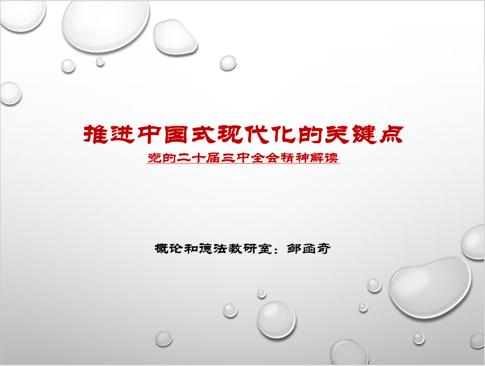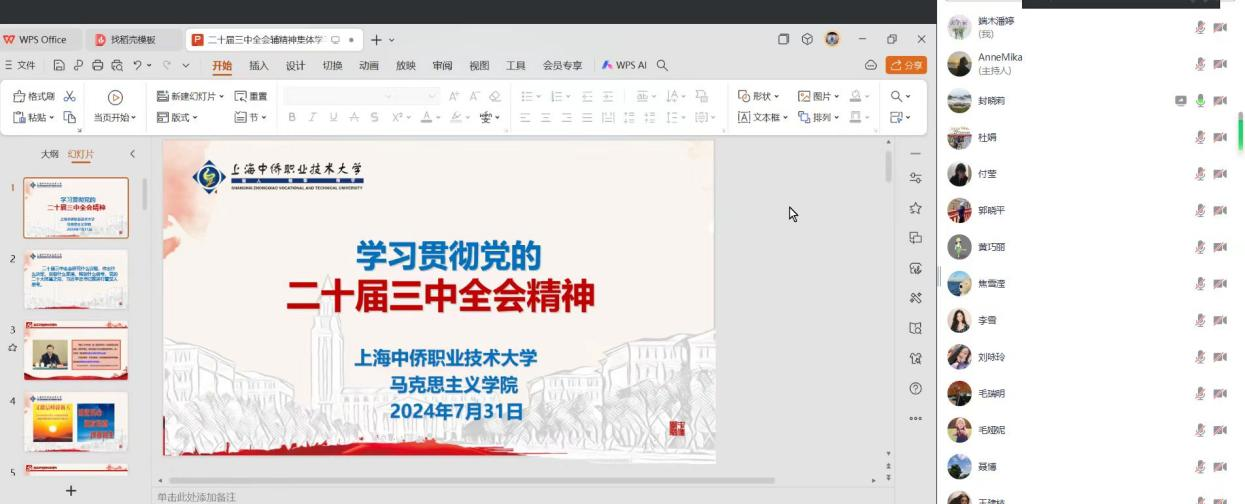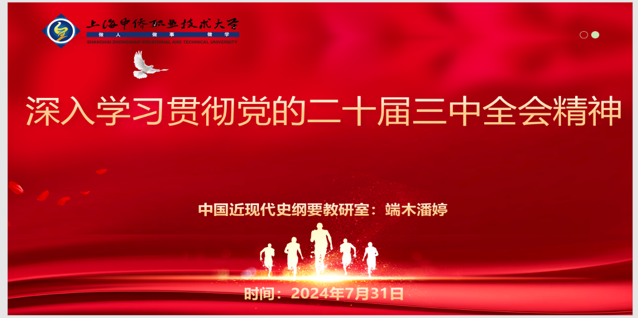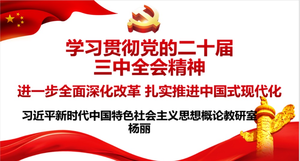 2024年7月15日至18日,中国共产党第二十届中央委员会第三次全体会议在京胜利举行。全会审议通过了《中共中央关于进一步全面深化改革、推进中国式现代化的决定》(以下简称《决定》)。会议对进一步全面深化改革、推进中国式现代化从各方面作出战略部署,彰显了以习近平同志为核心的党中央将改革进行到底的坚强决心和强烈使命担当,对以中国式现代化全面推进强国建设、民族复兴伟业具有重大而深远的意义。《中国共产党第二十届中央委员会第三次全体会议公报》一经发布,学院第一时间组织思政课教师进行自学。7月31日,学院组织全体教师集中学习全会内容,各教研室派代表分享心得体会。会议由马克思主义学院党支部书记封晓莉主持。马院全体教师参加。