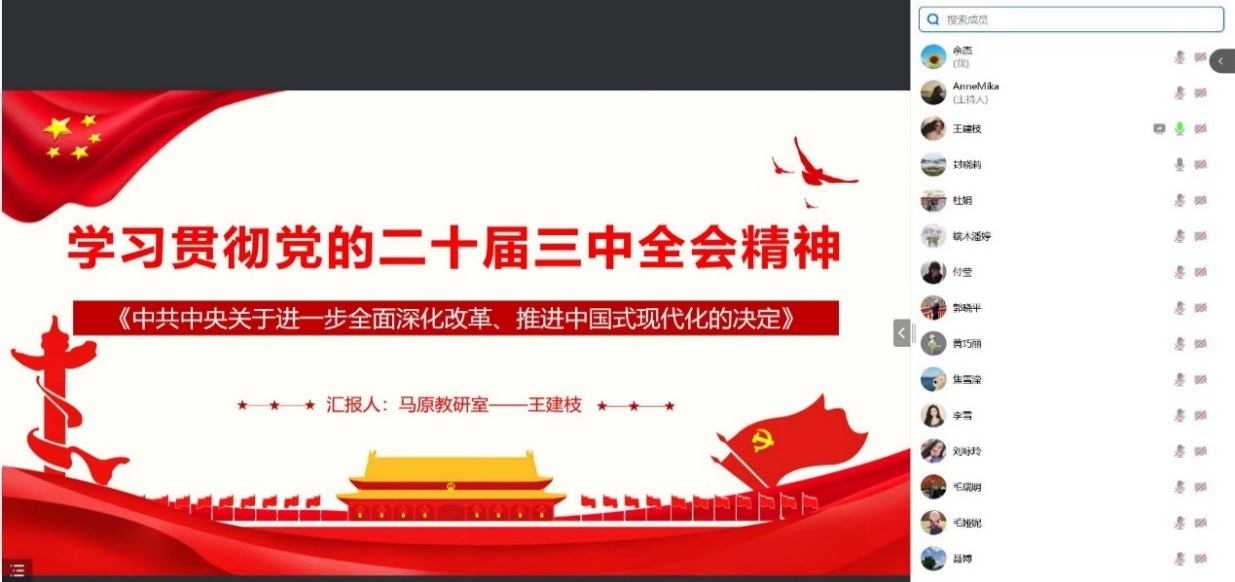马克思主义基本原理教研室教师代表王建枝分享了对《决定》的宏观解读,概括了《决定》中出现了一些新提法,并对思政课教师和党员干部如何学习二十届三中全会精神做出了分析总结。王老师强调对于二十届三中全会精神,既要认真领会其重大意义、核心要义、实践要求。又要从提高政治站位、深化思想认识、联系实际工作三个角度出发认真学习。更要以坚持主动作为、担当责任,问题导向、改革创新,廉洁自律、以身作则的原则认真落实。