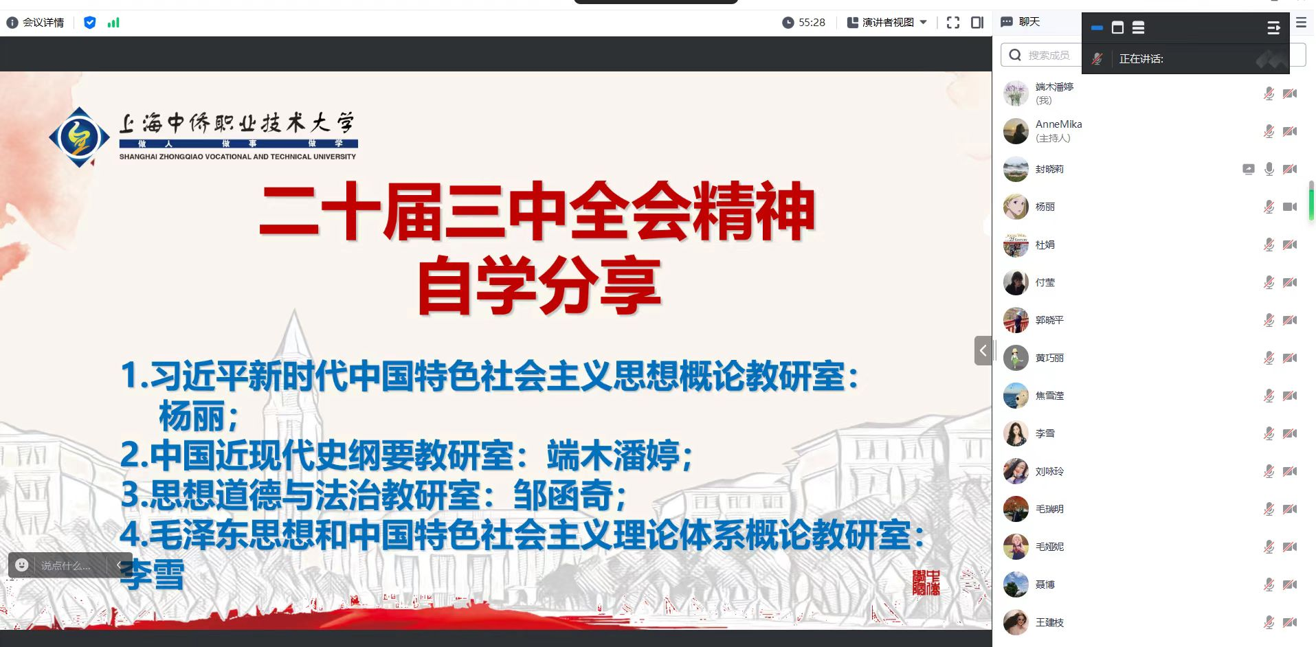 中国近现代史纲要教研室教师代表端木潘婷通过分享《决定》中出现的高频词汇:改革145次,深化89次,全面深化改革16次,中国式现代化24次等,强调了此次会议的重要指向。并谈到推动党的二十届三中全会精神进教材、进课堂、进头脑,是思政课教师的应尽职责,是思政课建设内涵式发展的内在要求。作为思政课教师首先要对照“政治强、情怀深、思维新、视野广、自律严、人格正”的目标要求,好好学习党的二十届三中全会精神;其次,以改革思维引领思政教学创新,密切结合学情,依托民办职业教学本科的特色,不断推动思政教育改革,坚持从“灌输说服”到“培根润心”,坚持问题导向,坚持学生自学、教师导学与小组讨论相结合,坚持教学过程中的全程性评价,注重实践教学。